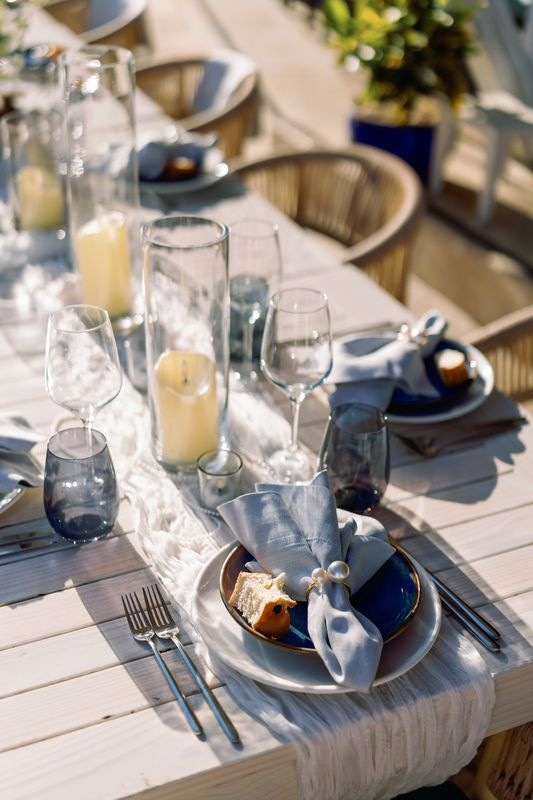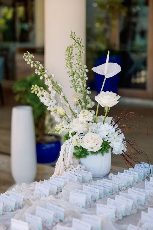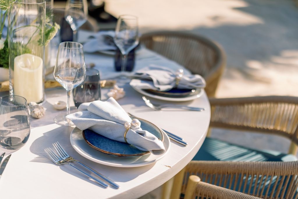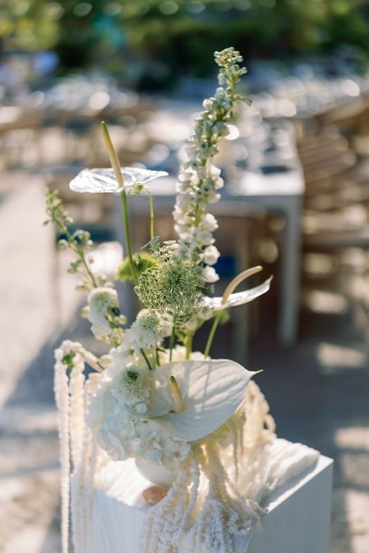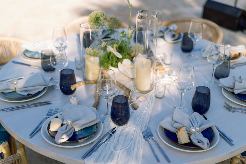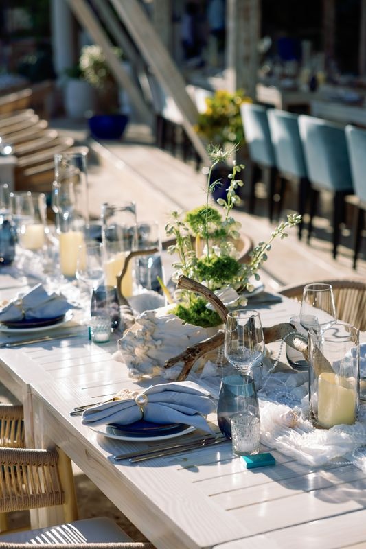 Prywatne tarasy Eden Roc z widokiem na turkusowe wody oferowały zapierające dech w piersiach krajobrazy. Delikatna bryza i złoty zachód słońca tworzyły spokojny nastrój. Dekoracje inspirowane były tropikalnym luksusem — kwiatowe kompozycje, miękkie światło świec i naturalne tekstury otaczały gości subtelnym pięknem. W miarę upływu wieczoru rozmowy, śmiech i szum fal łączyły się w idealną harmonię.