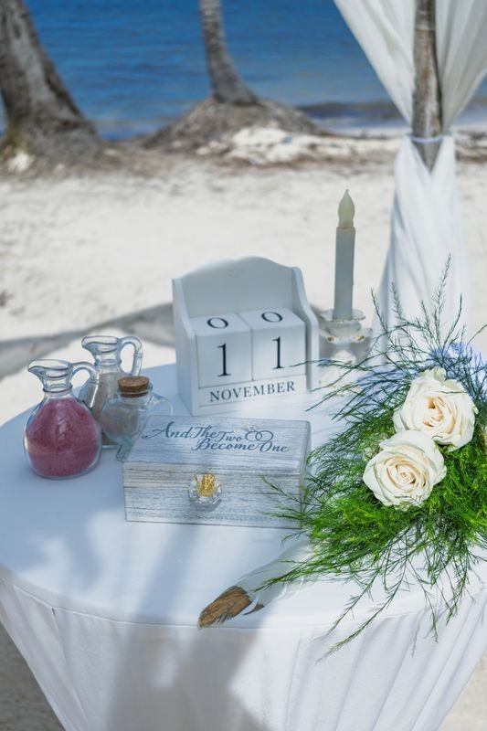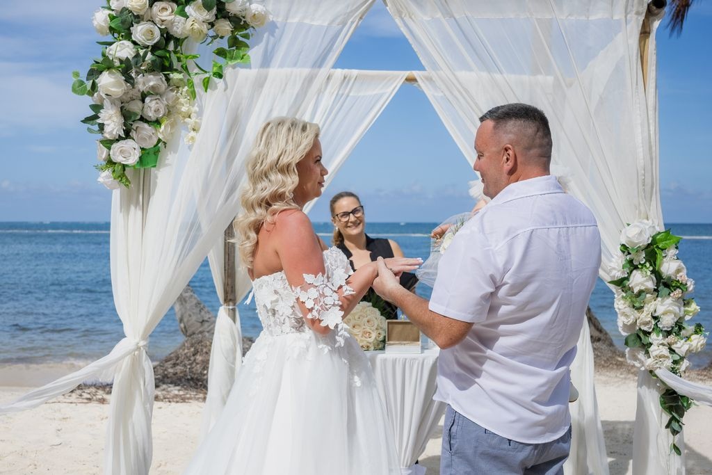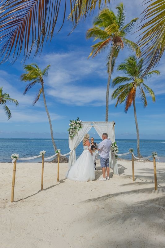 Ślub na plaży w Punta Cana: Para świętowała na brzegu ze swoją 1,5-roczną córką, bambusową arką, białymi tkaninami i białymi kwiatami. Turkusowe morze, miękki biały piasek i bujne palmy stworzyły spokojną i radosną atmosferę.