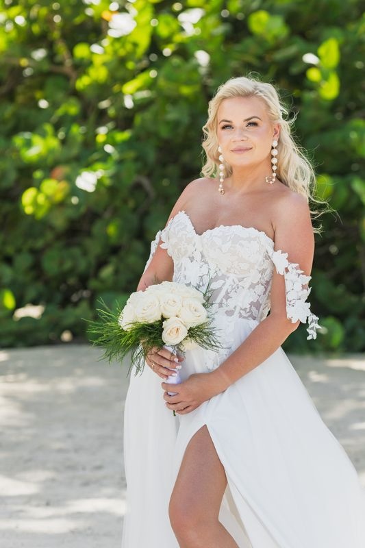 Ceremonia odbyła się bezpośrednio na białym piasku, tam gdzie fale delikatnie spotykają się z brzegiem. Prosta bambusowa arka stała na skraju wody. Ponadto ozdobiliśmy ją zwiewnymi białymi tkaninami i delikatnymi białymi kwiatami. Wystrój był lekki i elegancki. Delikatna morska bryza poruszała tkaniny, dodając ruchu każdemu zdjęciu.