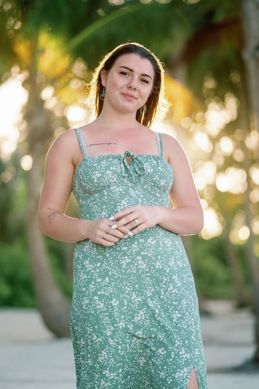 Następnie zdejmujesz opaskę z jej oczu. Przed nią ukazuje się okrągła arch dekorowana tropikalnymi kwiatami, ustawiona tuż przy oceanie. Dodatkowo miękkie światło zachodu słońca otula całą scenę romantycznym blaskiem.